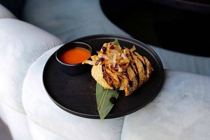 Pune pe una dintre ele somon, avocado, castravete și puțin sos. Acoperă cu cealaltă chiftea.